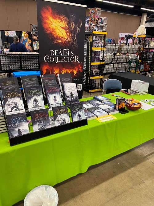 I have some new marketing materials. I *may* have a reveal of the new Death’s Collector cover. (The fiery guy at the left was the *losing* cover.)